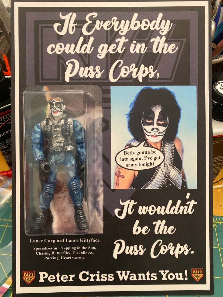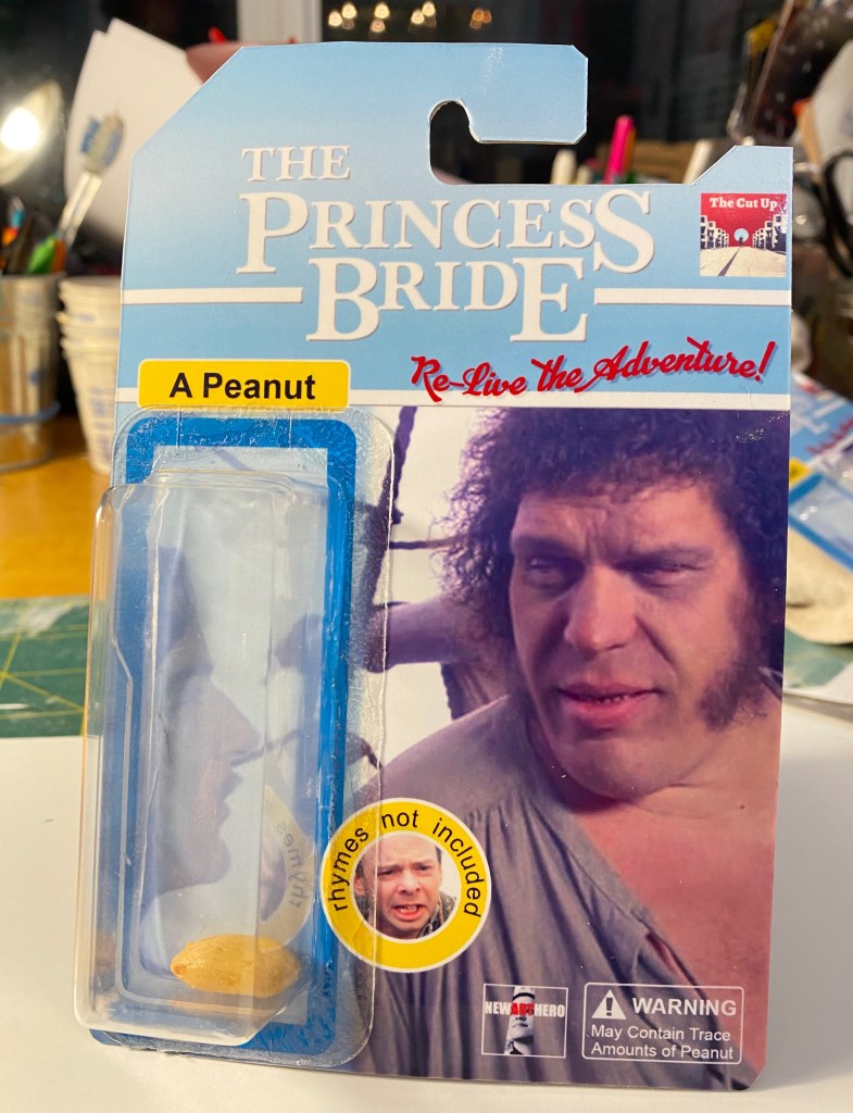 This is the first figure my wife and I made together. She’s kind of a nut so it’s not surprising she came up with this Princess Bride concept. I had some leftover hot wheels backing cards and blisters that made great packaging for a single peanut. Mash up of Seal Team Six and the greatest wildlife film star the world has ever known. Found this figure of a guy on a suitcase and am still confused as to who could have successfully pitched it . sculpted a puffy jacket and painted him up to be Del .This figure was a mostly bald guy reading a paper. Because that’s a fun toy for children. Gave him some hair and painted him up to be Neal. Painted this GI Joe to be a mashup of Kiss Army and a Marine Corps campaign from the 70s. Cut off these Barbie arms and made this Robin Ward look alike from the first episode of The Boys. So gross. My brother gave me this insane book. No idea what this figure was from but he needed a pretty extensive overhaul to become Marc MacYoung.