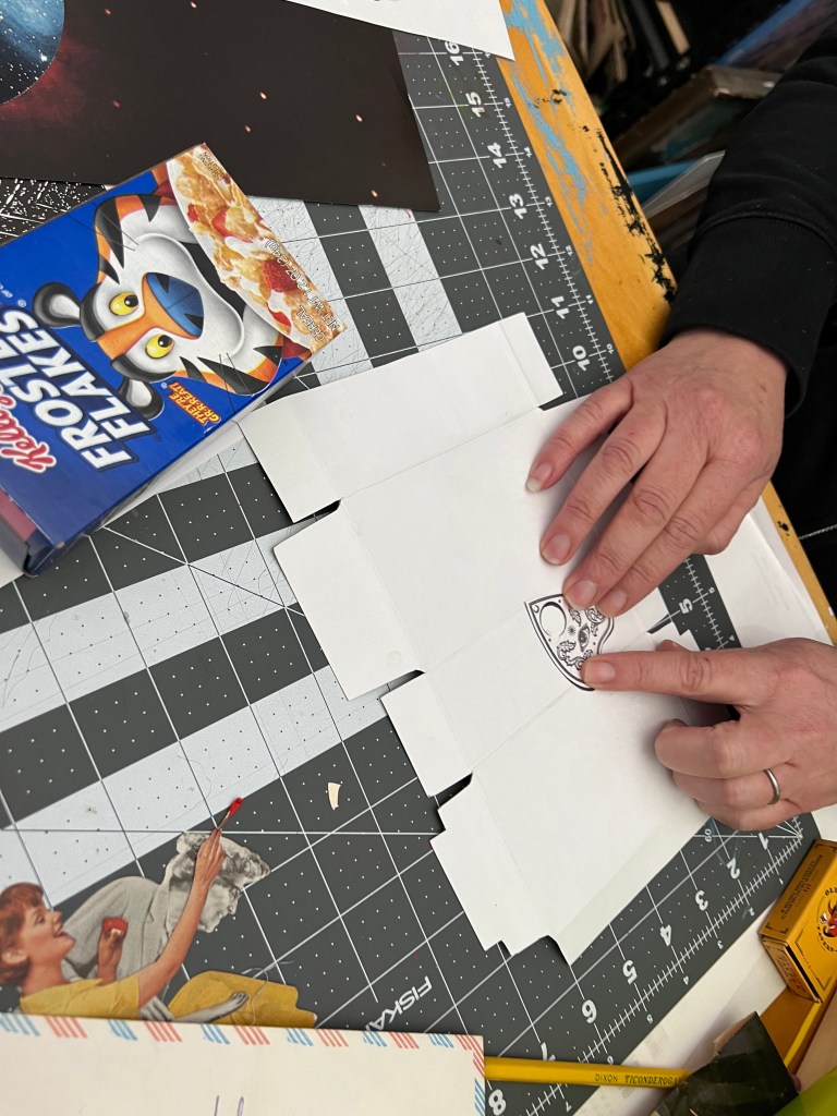 I threw together a cover and printed it out just to test it and found that none of the stock I could run through my printer was going to give that same feel as the chipboard of real cereal boxes so we ended up spray gluing the paper copies onto real boxes. This meant I got to eat a lot of cereal while I worked.