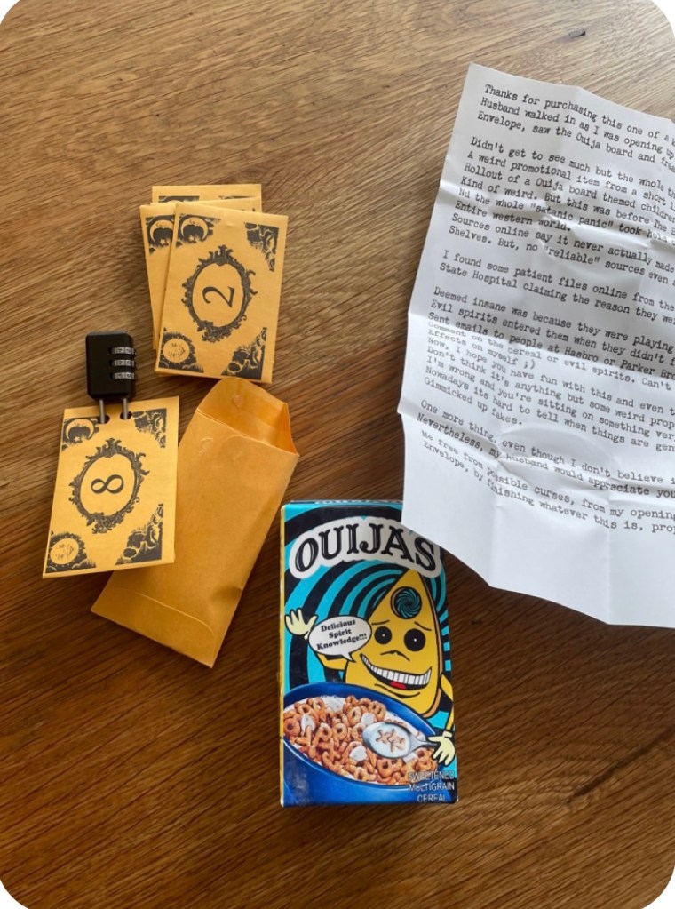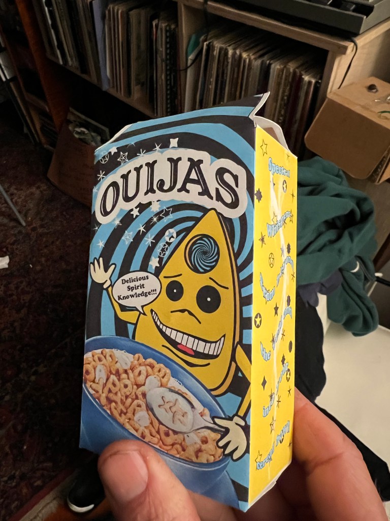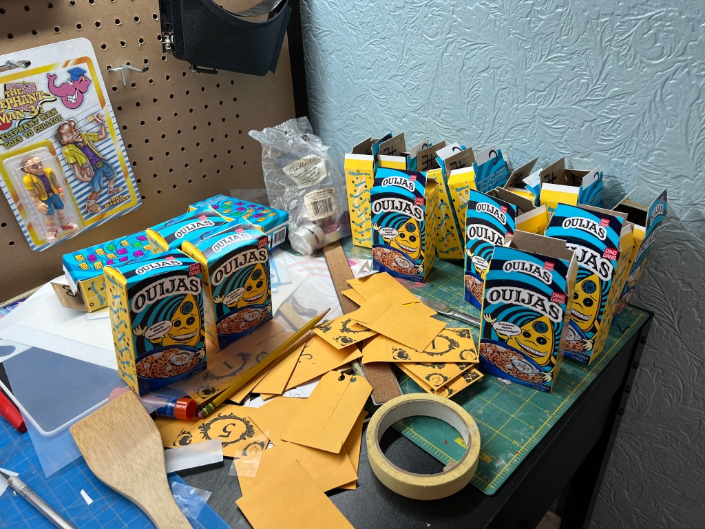 We decided to build the whole thing into one of those single serving cereal boxes since it’s just about the biggest box you can make using a single 8.5×11 sheet of paper. Fleshing the whole idea out took no small amount of coffee. In the end we settled on the whole game being a package from a discontinued 70’s era cereal based on Ouija Boards. This seemed like a good way to threaten demonic possession if you didn’t finish the game.