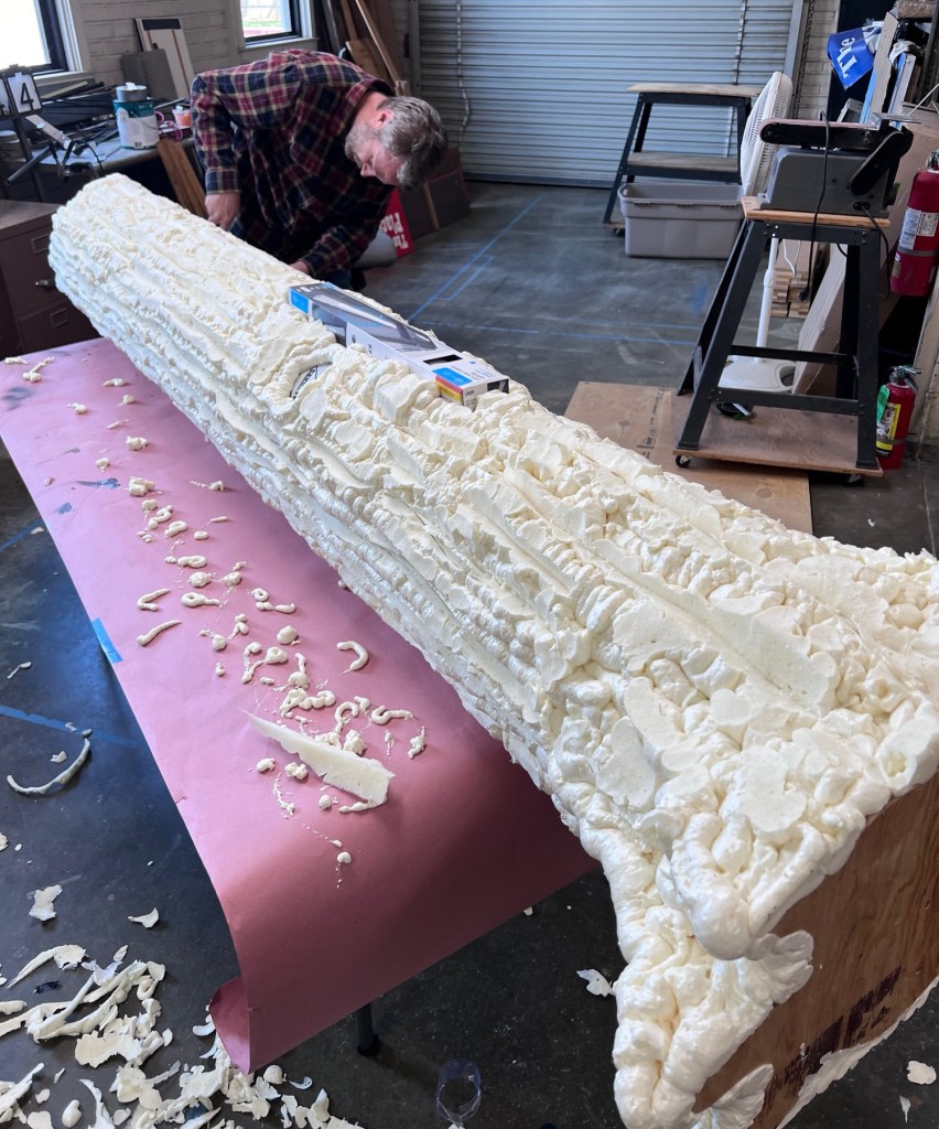We made a cardboard base and glued the bucket to it then added some cardboard buttressing to give it a more non-bucket shape. We applied the foam in a can in vertical stripes and let it dry overnight. The we carved it up with a razor knife and knocked down the hard lines with a rasp. After that we applied a mixture of “monster mud” that was about 3 to 1 joint compound and paint. This filled in a lot of the gaps and holes in the foam.
