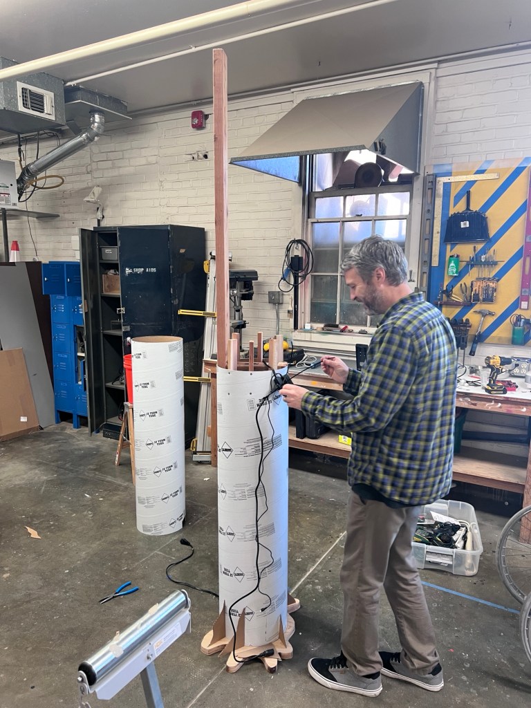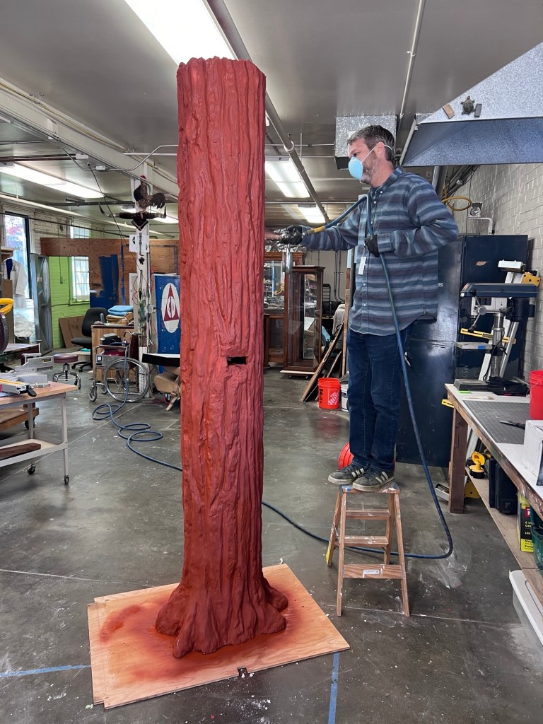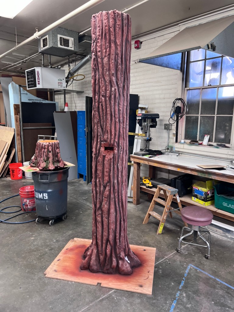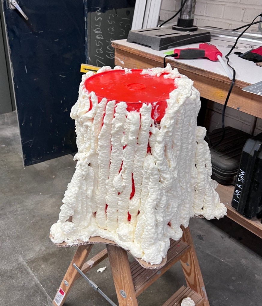 It seemed like building an 8’ tall fake tree trunk wouldn’t be too hard, at least if the videos on YouTube were to be believed. But before we got too deep into it we wanted to try our hand at building a stump out of a bucket, some cardboard and expanding foam.